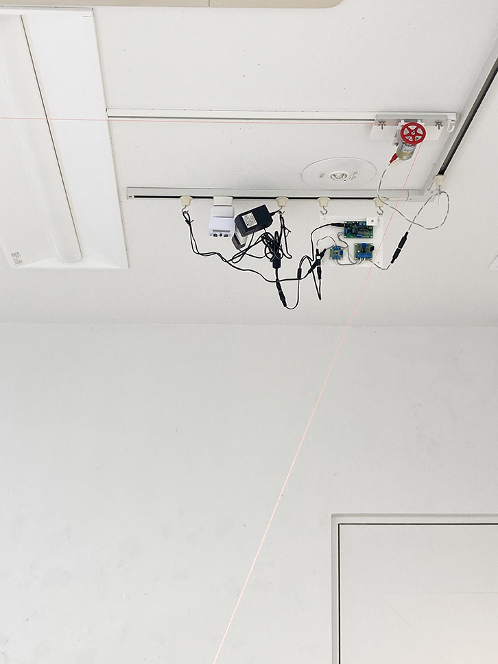 低速モーターで水糸を回す。水糸のたわみにより、プーリーとの摩擦係数が変化するために水糸の揺れが発生する。水平面と垂直面の空間に三角形をつくる。
